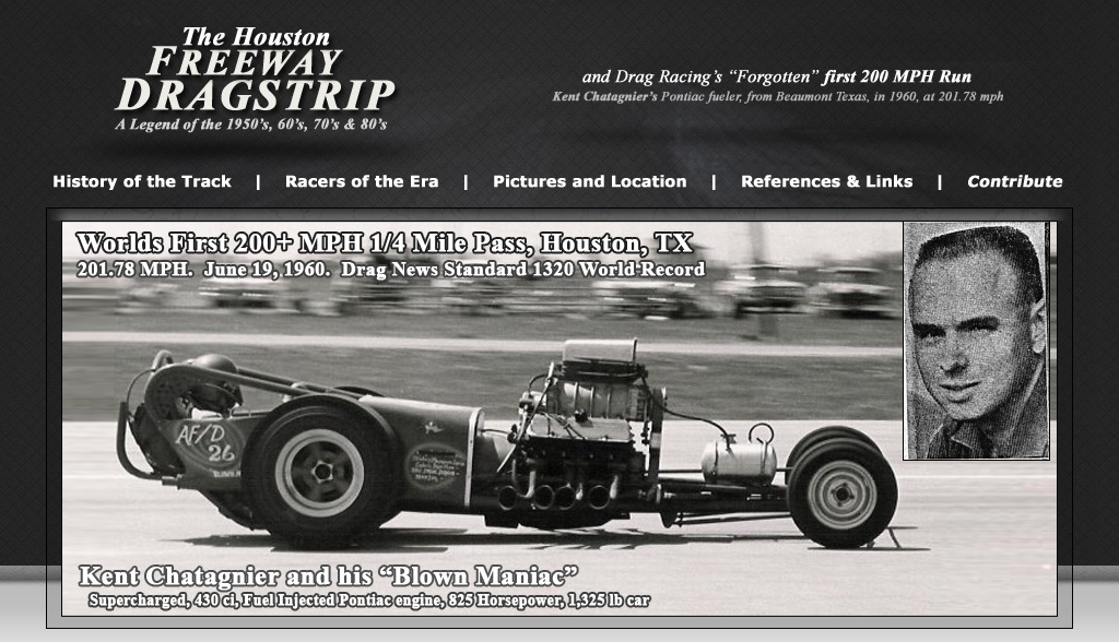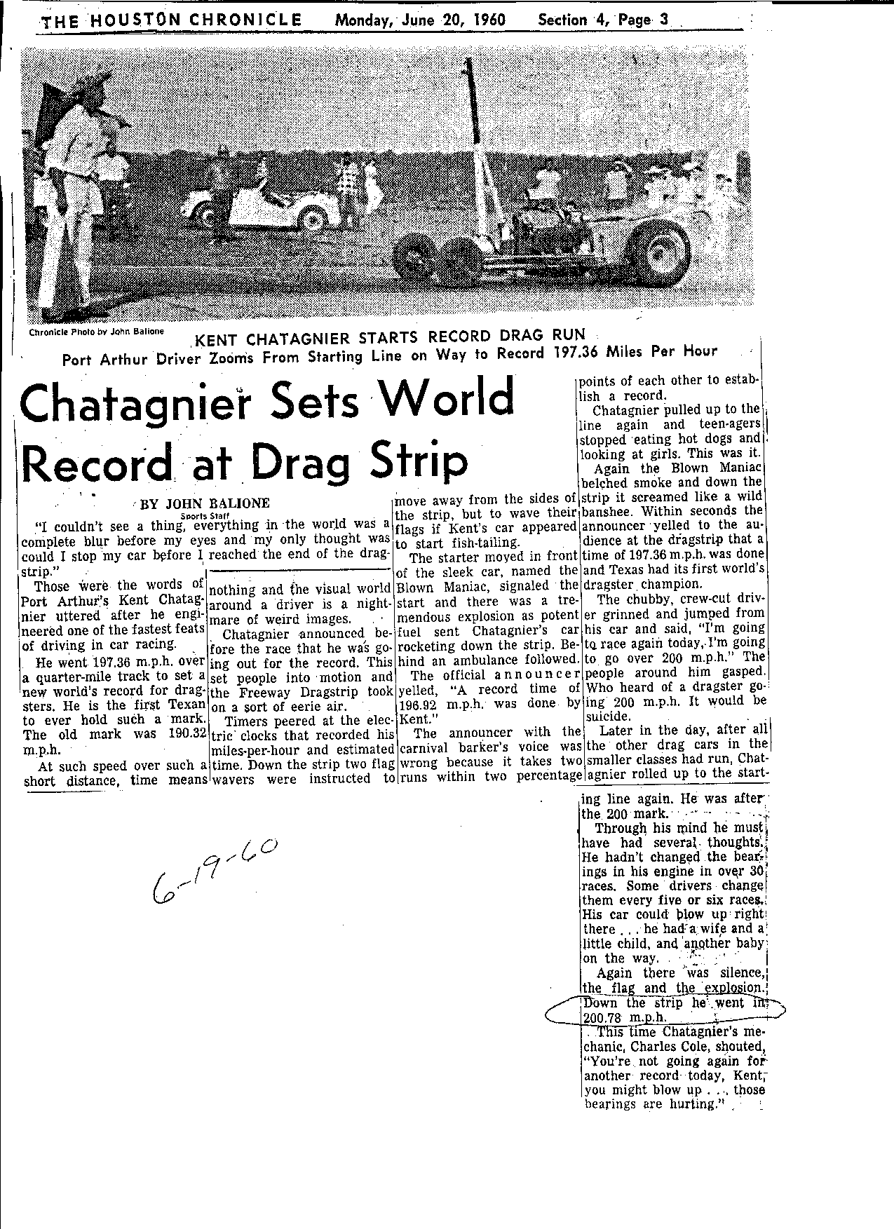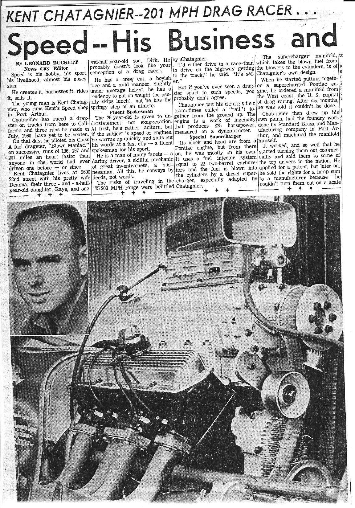 "Kent Chatagnier was the first person, in the world, to receive a 200 mph time slip. He ran the 'Kent's Speed Shop' fueler out of Port Arthur, Texas, with a supercharged, fuel burning Pontiac motor. Competing at Houston on June 19 1960, Kent made four runs between 197.36 and 201.78 mph. As the speed was backed up, as called for by the Drag News Standard 1320 rules, that were regarded as the bible in those days, it was recognised as the official A/FD speed record for some months. There was no AA/FD at the time. In 1961 Drag News wiped all the records clean and instituted new rules for setting records." (13) BIO: By Deanna Chatagnier, Kent's wife: Kent started racing in 1953 as a sophmore in High School. He studied mechanical engineering in College, had a black 55 T-bird. He built a Pontiac Dragster in 1956 and had the first covered trailer. His record breaking car, the second dragster, was a 430 cubic inch 825 horsepower fuel injected engine called the Blown Maniac. He designed and built his own intake manifold adapter for the supercharger, after being denied by a large manufacturer that it couldn't be done. He sold them to Mickey Thompson who used them on his 4 engine salt flat car. Kent started racing in 1953 as a sophomore in High School. Since then no other sport held his interest. He studied mechanical engineering in College, had a black 55 T-bird. (our dating car) He built a Pontiac Dragster in 1956 and had the first covered trailer. I still have blue wool Mickey Thompson jacket that says "170 miles" on the back. I think it was won at Mickey’s Lion’s Drag Strip in California. His record breaking car; the second dragster, was a 430 cubic inch 825 horsepower fuel injected called the Blown Maniac. I can remember he did not and could not find an adapter for the manifold. He was told it could not be done. So he drew up his own plans, built a wooden mould and went to the local refinery and had the foundry work done, then machined the manifold himself. It worked so well that he sold them to Mickey Thompson who used them on his 4 engine salt flat car. It was a patented item, but could not turn them out to the proportion to be profitable. Kent opened a speed shop "Kent’s Speed and Auto Supply" in 1965 in Groves, Texas a suburb of his home town. He continued in this business for approximately 10 or 12 years. Later he moved the shop to Beaumont, Texas with a new name American High Performance. It was during the "Mag wheel" days and it was a very successful business for several years. He also raced a funny car for a team out of Dallas/Fort Worth area for a short period. The Car was called "The Texas." During this time, he raced a Keith Black drag boat called "Cole Black". He still holds the record in Austin, Texas. He also raced motor cross. Kent was a very intelligent, methodical, calm, soft-spoken, gentleman. I have never heard him brag about his racing. He won trophies that filled up the whole wall, but they were displayed in the bedroom on shelves. Kent stopped racing and went on to become a Roofing Consultant, drawing up specifications and details for commercial buildings. He had worked his way through college working in his dad’s roofing business and was putting that knowledge to use in a mechanical, professional way. (His mother said Kent was carrying shingles on the roof at 9 yrs old.) He had great carpentry skills; and great mechanical skills; and was a perfectionist with anything that was a challenge to him. He has specified roofs for over 200 school districts in the state of Texas and surrounding states, for countless commercial state and city buildings. Was called for a special assignment in Washington DC by a firm and over nine months specified roofs for Embassy Buildings, Rockefeller’s ranch buildings, etc. too many to remember. He was known as the little Texas in his cowboy boots. He only wore cowboy boots; he had several pair. His only other shoes were Simpson red racing shoes. Wherever he went, neat as a pin, he left a positive impact on the people around him. He was well respected as a person, and in his field of work. As always, he surrounded himself with a library of books and was self taught. He went after the consulting profession just as he did racing. He made an impact on the roofing industry that was admired by piers, architects, engineers, and manufacturers. The buildings he participated in were awarded many, many awards. The most recent the Palmer Center in Austin. His specifications were flawless; his details explicit, and to perfection. He was admired and sought after by many for his expertise. His love for flying started when he was a little boy. He got his license at 19. He continued to fly until is death at 64. He loved it as much as he loved racing. Maybe more. We started going to the Winternationals and Indy. Sitting in the Top Eliminator Club. The last race we went to was the Gatornationals about 2 weeks before his death. He had a chance to talk and visit with Don Gartlis there. The last 4 months of his life he had come up with a plan to retire from the Roofing Consultant business, and do the two favorite things in his life. Racing and flying. He was putting a team together for a fuel dragster. And of course flying to the races. Three cars, Eddie Hill was going to join us as the oldest Driver, our granddaughter Brittny 18 as the youngest. The third car he said was for back-up, (HA! HA!).... We had sponsors looking at it, had plans for the large trailers. He and I and Brittny flew in the Baron from Lakeway, Texas to Pomona where Brittny attended and got licensed for driving at Ed Hawley’s school for race drivers in Pomona on April 22, 2000. He was so proud of her; and stood at the end of the Drag Strip with hands clutched waving over his head when she qualified. Quite a show of emotion for Kent Chatagnier. We were all going racing!!! He was so very happy!!!! A few days later,,,That awful fatal day: He left our house, which has a hangar attached and 