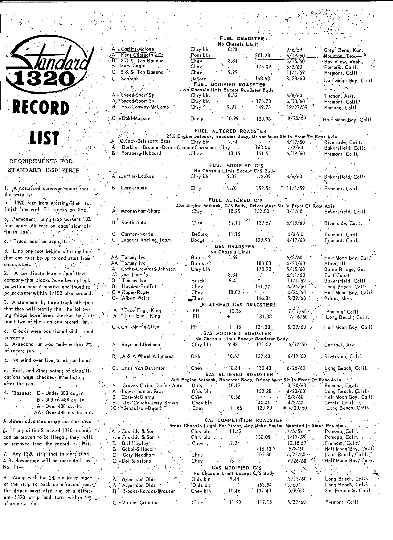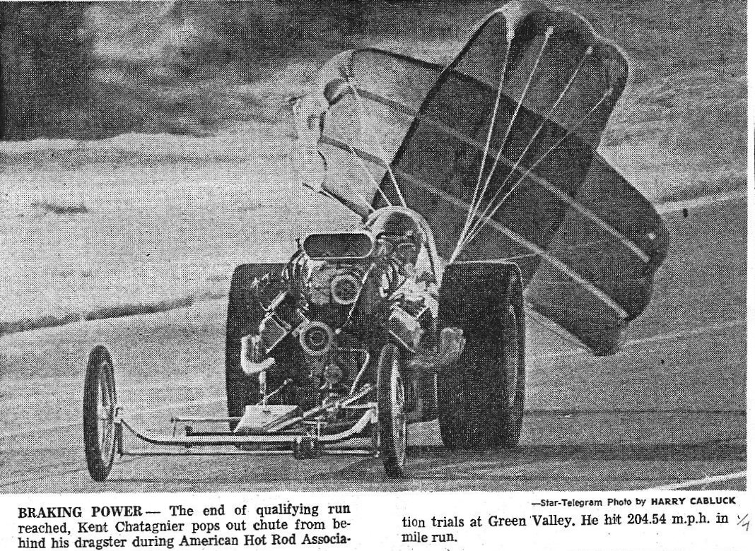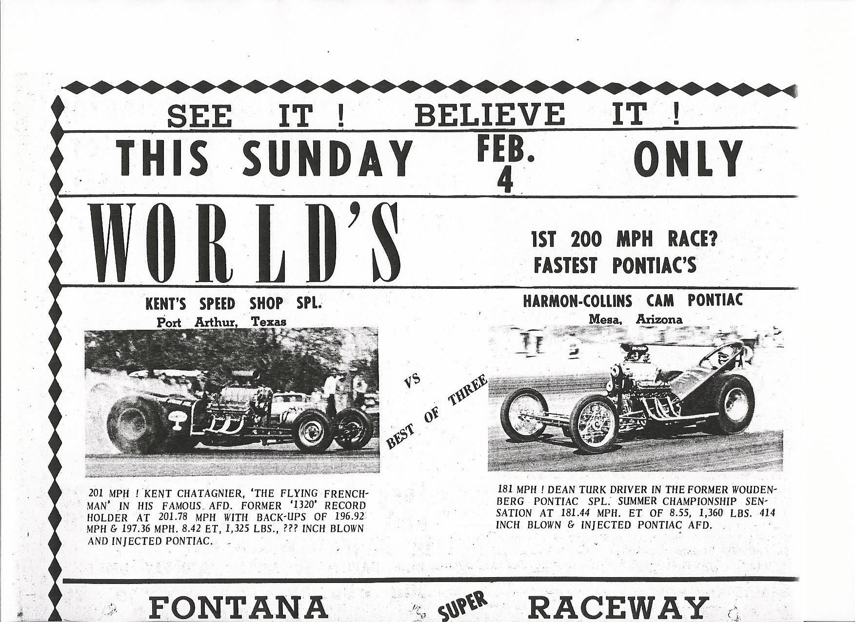 There seems to be some controversy as to who ran the first 200 mph pass: Chris Karamesines was credited with a 8.87 ET at 204.54 MPH at Alton Raceway, Illinois on April 24, 1960. He never ran close to 200 mph for years after that however. The March 1965 issue of the "Drag Racing" magazine published in England had this to say about the run: In May, 1960, a Greek by name of Chris Karamensines (sic), was said to have covered the standing quarter mile in 8.87 secs. with a terminal of 204.546 m.p.h. The strip was at Alton, Illinois and the officials were said to have checked the accuracy of the clocks and remeasured the distance just to make sure all was genuine. At that time Don Garlits was using Giovannoni camshafts and turning times of 8.73 secs. with a terminal speed of 175.78 m.p.h. and few could beat him. As Karamensines was using Iskenderian camshafts, Giovannoni decide to do some investigating and found out that if the timing gear blew a certain fuse, a speed of 204 m.p.h. was recorded irrespective of the actual time of the car. To make sure everybody was aware of this they publicised these facts and added that ". . . when the 200 m.p.h. is finally broken, the driver will receive the credit regardless of the make of cam he is using." By a twist of fate it was Garlits who managed this some four years later, towards the end of 1964. The Giovannoni prediction came true and everybody realised that the Garlits speed was genuine. Unfortunately, Garlits had in the meantime stopped using Giovannoni camshafts and changed over to Crower! Many sources, including the NHRA, refer to Don Garlits run of 7.78 seconds at 201.34 mph set at Island Dragway, New Jersey on August 2 1964 as being the first 200 pass. It was the first NHRA speed record over 200 mph. Don had run 200.44 mph in July 1964 at Detroit Dragway, but had not backed it up for the record. Drag Racing Story of the Day! Drag News published the record for several months as the "official" standard 1320 AA/FD speed record. After a while, Kent no longer was credited as being the first 200 mph run. The argument through the years has been that he never did it again. Chris Karamesines did not back up his 204 at Alton and did not run close to 200 again for years. Ivo didn't back his 200 up. No one did it and backed it up until Garlits did EXCEPT that unknown kid from Beaumont Texas, Kent Chatagnier. Another forgotten Texas team was that of Burris-Huiett, who ran a Chrysler (392) out of Houston. They didn't travel much due to job commitments, but were heavy hitters on the local scene. They were runners up to Art Malone at the grand opening of Green Valley Raceway in Ft. Worth in 1959. Art made a statement that appeared in Drag News. He said that while he had never heard of these guys, they had put the fear into him. Art stated, "They are dead serious racers." They ran for a few more years then kind of faded away. The cost was just too much for a couple of Chrysler-Plymouth dealership mechanics. Harrison/Wheels Lee Schelin, Standard 1320 Group founder, comments: The Greek did not back-up the 204 mph on the same day/same track as required by Drag News, but did run 199 mph the following week in Kansas. Lee Schelin TV Tommy Ivo comments: In my book, Garlits was the one to run 200. I don't remember any 200 of mine that was crocked about. Do you remember my story about Garlits telling me how to do it (the cam)? [See the 7/03 Story of the Day. bp] In later years, I got a bogus 250 that wagged a few tongues, and rightfully so. It was about the era of my first five-second run that NHRA disputed. And the papers picked up the 250 mph story with too much zeal because of the "5" controversy. TV Tom (14)![]() ![]() ![]() Kent's first car he built, before the 2nd World Record car "Blown Maniac" ![]() ![]() ![]() ![]() Kent campaigned other cars after the Blown Maniac broke the 200 mph barrier. Here is a Star-Telegram clipping of him running 204 mph at an AHRA meeting. He also raced motorcross, dragboats, and funny cars. ![]() Kent's Shop, "Kent's Speed Shop", ~1964 ![]() ![]() |